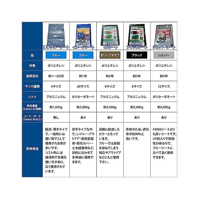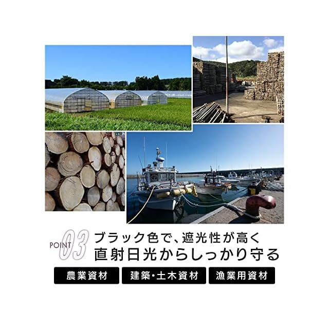 【特徴】厚手タイプのイメージシートです。屋外使用目安は約3年と長期に使用できます。遮光性の高いブラックのシートで、建築・土木・農業・水産他の野積み用カバーにも最適です。
