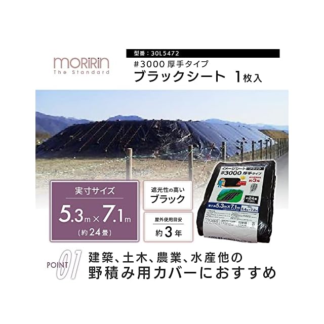 商品名:モリリン ブラックシート レジャーシート #3000 実寸約5.3m×7.1m 約24畳 厚手 屋外使用目安約3年 ハトメ数28 雨よけ 風よけ 野積み 30L5472