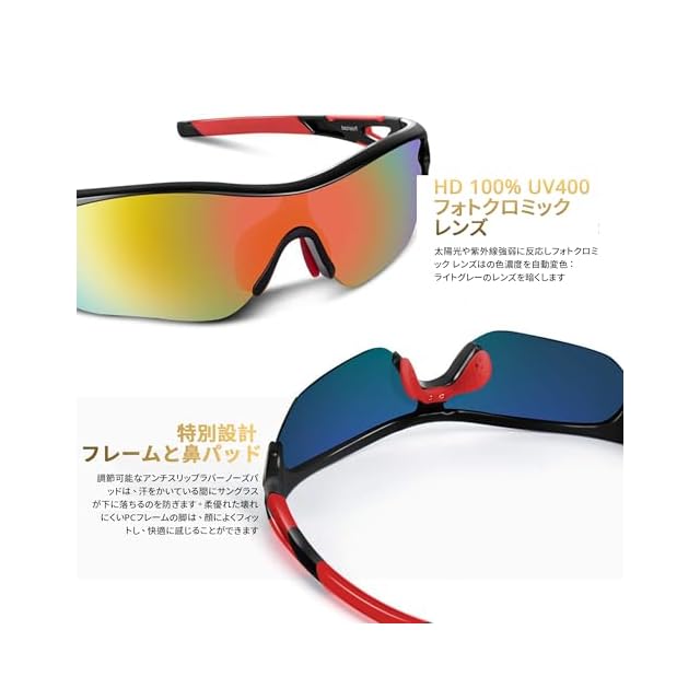柔らかいフレーム素材: 軽量なTR90リムレスジャケットフレームの設計は剃りにくく、耐衝撃性、耐傷性、耐久性に優れた壊れにくいです。汗をかいたときにサングラスが落ちるのを防ぎ、顔にしっかりとフィットする柔軟滑り止めゴム鼻パッド。サングラス 夜間運転用は高品質で超軽量、強度、柔軟性、安定性が高く、高速スポーツ時にクリアな視界を提供しており、日本人のために設計されています