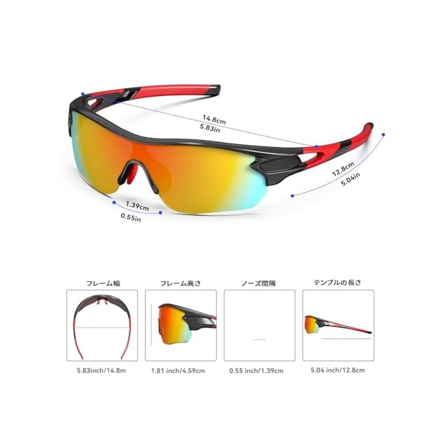 完璧なフィット感:BEACOOLスポーツサングラスは完璧なフィット感を提供するように設計されています。レンズ幅70 mm(2.76 inches)、ノーズブリッジ14mm(0.55inches)、フレーム長148 mm(5.83 inches)で、男女ともに快適な掛け心地を確保しながら、最適なカバー力を提供します。また、フレームとレンズのカラーコンビネーションが豊富です