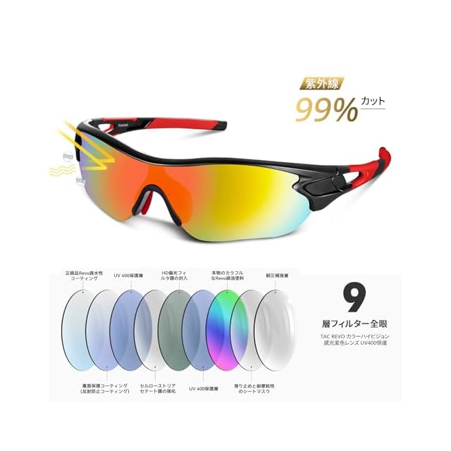 高品質のREVOカラーハイビジョン偏光レンズ:すべての偏光レンズは高品質破砕防止TAC材料で作られており、UV 400レンズ保護コーティング、有害なUVAとUVB 99.9%をブロックし、本物の色を復元し、REVO偏光レンズを使用して元の色を維持し、効果的に視覚の透明度とコントラストを改善し、より簡単に反射や散乱光を排除します。偏光サングラスは風景をよりクリアで柔らかくし、目の負担を減らします