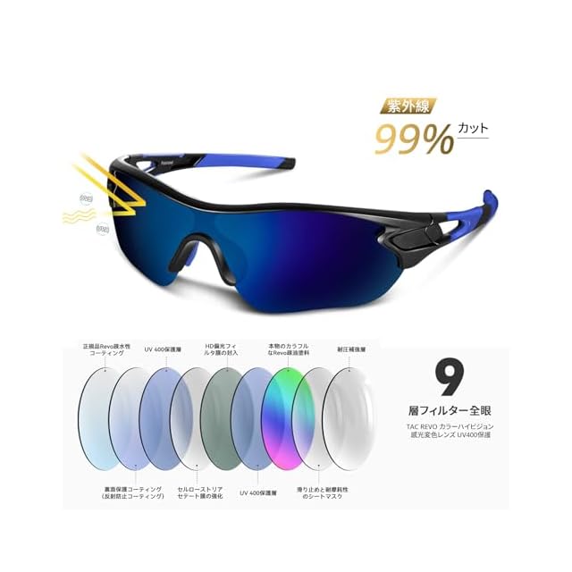 高品質のREVOカラーハイビジョン偏光レンズ:すべての偏光レンズは高品質破砕防止TAC材料で作られており、UV 400レンズ保護コーティング、有害なUVAとUVB 99.9%をブロックし、本物の色を復元し、REVO偏光レンズを使用して元の色を維持し、効果的に視覚の透明度とコントラストを改善し、より簡単に反射や散乱光を排除します。偏光サングラスは風景をよりクリアで柔らかくし、目の負担を減らします