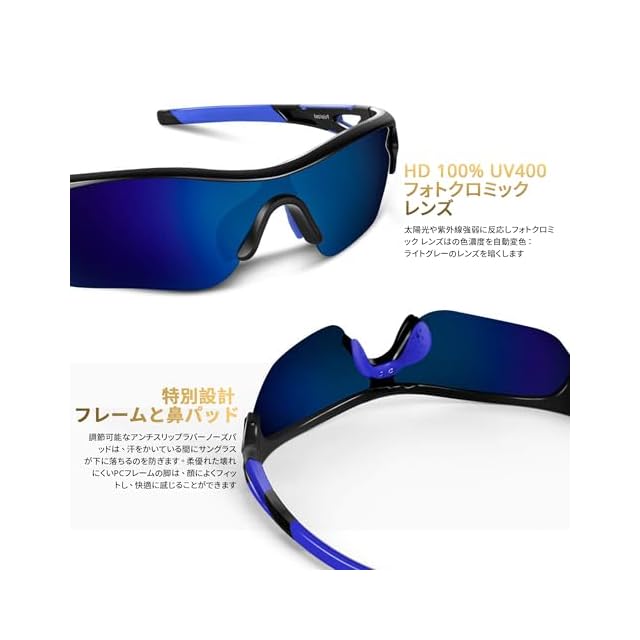 柔らかいフレーム素材: 軽量なTR90リムレスジャケットフレームの設計は剃りにくく、耐衝撃性、耐傷性、耐久性に優れた壊れにくいです。汗をかいたときにサングラスが落ちるのを防ぎ、顔にしっかりとフィットする柔軟滑り止めゴム鼻パッド。サングラス 夜間運転用は高品質で超軽量、強度、柔軟性、安定性が高く、高速スポーツ時にクリアな視界を提供しており、日本人のために設計されています