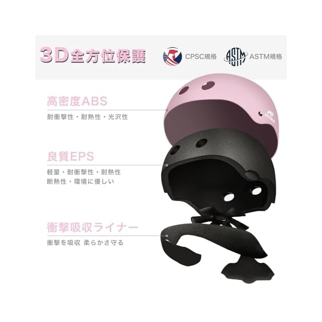 【子供も大人もしっかり守れる優れた品質】外殻は耐熱性・耐衝撃性・光沢性などの特性をもって高密度ABSを採用します。内殻は軽くて、衝撃にも強い、断熱性も優れ、着火したとしても有害物質を発生させないので環境に優しいEPSでもあります。外部からの衝撃をヘルメット全体で吸収して、頭に伝わる衝撃を最小限に食い止めて、子供でも大人でも、転倒時に頭部の安全性を追加させます。