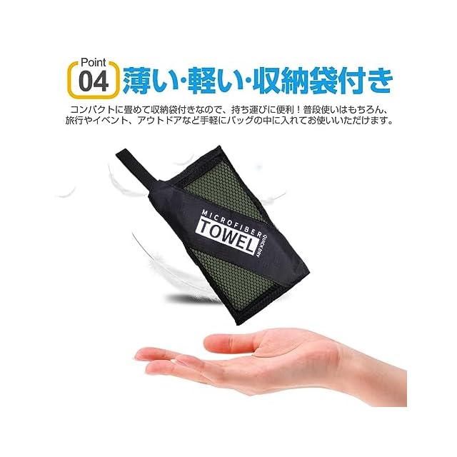 【コンパクトで軽量】薄い生地なので、折り畳み易く、簡単に収納袋に収まる。折り畳み時は、薄さは普通の綿タオルの1/4コンパクトなタオル。速乾タオルサイズ:40cm×80cm 付属品:収納袋