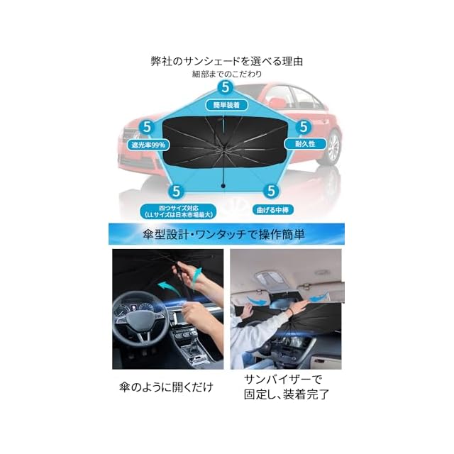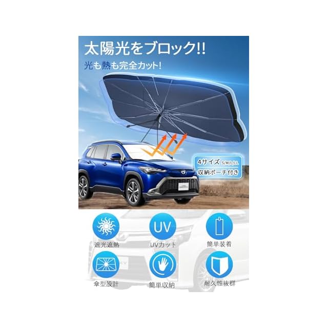 【様々な車に対応可能・幅広い用途】 4サイズ選択可能で99%の車のフロントガラスに対応できます。軽自動車サンシェード、ビジネス車、SUV、MPVなどの中大型車もコンパクトカー、スポーツカーなどの小型車も使用できます。普段駐車時の日除け用だけでなく、車中泊や仮眠時にプライバシーの保護に役に立てます。雨の日に傘を忘れた時本製品も仮の傘として使用でき、炎天下でも仮の日傘として使われます。Lサイズ(145*80cm)対応車: アイシス アクア アベンシス ヴィッツ オーリス カムリ カローラ カローラツーリング クラウン シエンタ ハリアー プレミオ ラクティス C-HR ist WISH SAI アコードハイブリッド ヴェゼル ハイブリッド グレイスハイブリッド ジェイド フィット レジェンドハイブリッド CR-V CR-Z nv200バネット シルフィ ティアナ デイズ ルークス ノート マーチ ラフェスタハイなどSUV,セダン。