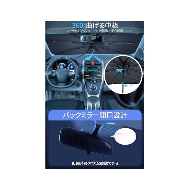 商品名:【強化版 曲がる傘柄】 サンシェード 車 フロント 車用サンシェード 折り畳み式 傘型サンシェード 日除け フロントシェード 遮光断熱 車用パラソル 紫外線対策 カーサンシェード 収納便利 収納ポーチ付き バックミラー部切りデザイン プライバシー保護 (L(145*80cm))