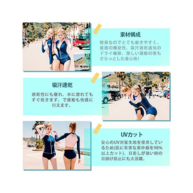 【適用場合&水陸両用】海辺のみならず、軽量なのに伸縮性抜群の生地でとても動きやすく、吸汗・速乾素材なので運動に最適です!夏場のウォータースポーツや野外活動の際、海、ジム、プールやビーチ、、温泉と幅広いジャンルで使える便利なスポーツ・アイテムです。通勤、通学、ランニング、ヨガなど、スポーツウェアとしてもご利用いただけます。水に濡れても快適に活動できる生地を使用。前開き対応のラッシュガードは着脱も簡単です、着替えに便利。