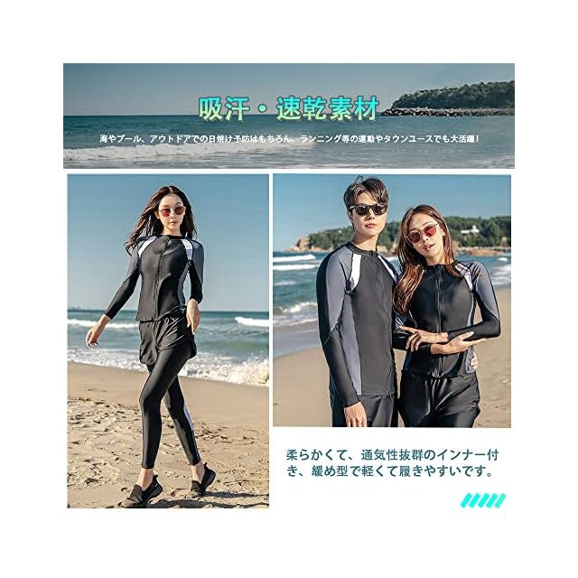 【適用場合&水陸両用】海辺のみならず、軽量なのに伸縮性抜群の生地でとても動きやすく、吸汗・速乾素材なので運動に最適です!夏場のウォータースポーツや野外活動の際、海、ジム、プールやビーチ、、温泉と幅広いジャンルで使える便利なスポーツ・アイテムです。通勤、通学、ランニング、ヨガなど、スポーツウェアとしてもご利用いただけます。水に濡れても快適に活動できる生地を使用。前開き対応のラッシュガードは着脱も簡単です、着替えに便利。