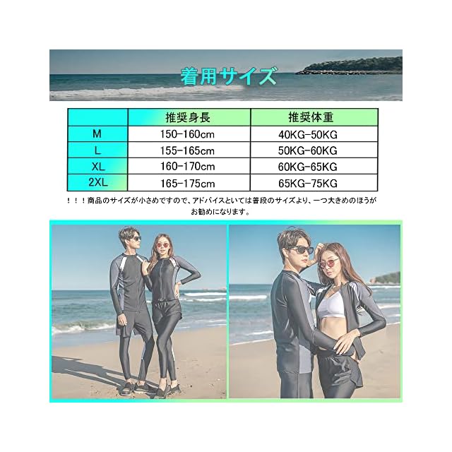!!!商品のサイズが小さめですので、アドバイスといては普段のサイズより、一つ大きめのほうがお勧めになります。【セット内容&着用サイズ】長袖ラッシュガード、ショートパンツ、ブラ、レギンス、ビギニショーツがセットになっています。必要なものがセットになっているので、届いてすぐに海に行くことができます。長袖ラッシュガードとレギンスセット、レギンス付き足首まであるので、虫刺されやクラゲ対策、擦り傷などの外傷対策にも。【着用サイズ】【M: 推奨身長150-160cm/推奨体重:40KG-50KG】【L:推奨身長155-165cm/推奨体重:50KG-60KG】【XL:推奨身長160-170cm/推奨体重:60KG-65KG】【2XL:推奨身長165-175cm/推奨体重:65KG-75KG】※サイズを選択する時サイズ表を参照してください。