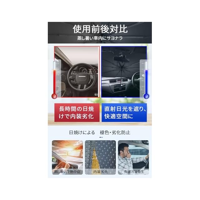 【ほとんどの車種に対応】4サイズから選べる傘型サンシェードは、軽自動車サンシェード、コンパクトカー、コンパクトSUVから大型SUV、ミニバン、商用バンまでほとんど全ての車種のフロントガラスに対応しています。※少し高さが足りない場合はサンバイザーを降ろせば日が入りませんでした。【ご注意】サンシェード 車 フロントは車型によって、多少誤差がありますが、ご購入前に、フロントガラスのサイズご確認ください。