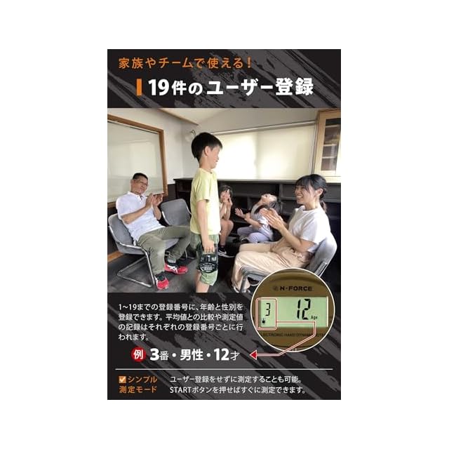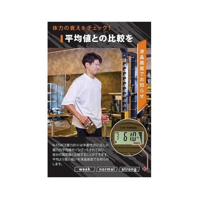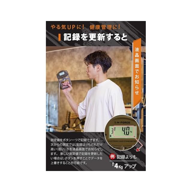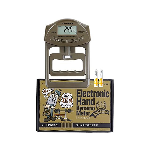【※乾電池の挿入について】 本体裏面の電池ボックス蓋をスライドして開け、単4アルカリ電池を+が内側になるようにセットしてください。(電池がうまく入らない場合は、電池を指で回転させながら挿入することで簡単に入ります) 日本国内のスポーツジム、介護施設、学校、法人、団体への導入実績が多数あります。もちろん一般家庭でも多く使用されています。 大き目デジタルが特徴の握力測定器。N-FORCE正規品は、ユーザー登録機能付。 正規品ならではの機能1 ⇒ 前回の測定値を上回ると、液晶画面が教えてくれる。やる気が継続します。 正規品ならではの機能2 ⇒ 年齢/性別ごとの握力平均データがインプットされている。平均値は目標の目安になるので、とても便利です。 グリップの幅が自由に調整できるので、手の小さい女性や子供もご使用いただけます。 1年間の製品付き。 握力計測器必ず正規品の購入をお願いいたします。 【以外と知られていない握力の重要性】 ・重い荷物も持てるようになる ・握る力だけでなく、腕力の強化にもなる ・トレーニングすると、二の腕が太くなる デジタル液晶で0.1kg単位までがクッキリ表示されます。 最大90kgまで計測可能。以下の一般的なトレーニング器具との併用を推奨します。 ハンドグリップ ダンベル リストトレーナー トレーニングチューブ
