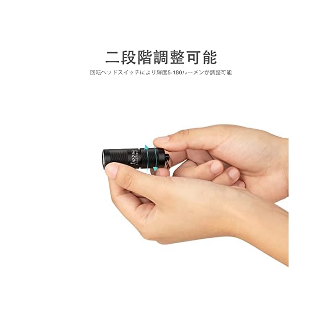 [高輝度&二段階調節可能] 五面発光の Chip Scale Packaging LEDを装備し、高品質の PMMA TIRレンズを加え、均一で柔らかい光を出力できます。照明輝度は180ルーメンに達し、48m先の目標物も簡単に照らし出します。更に、懐中電灯のヘッド部を回すだけでHigh、Lowの2段階の輝度を気軽に切り替え、ニーズに合わせて設定できます