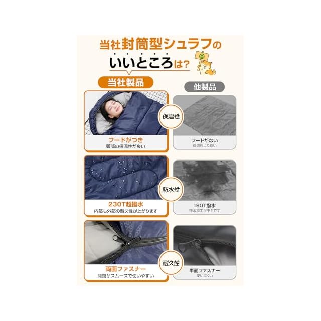 【230T超撥水・優れる素材】表地:耐水性と耐引き裂き性備え、耐水性の高い230Tナイロン素材を使用しておりますため、防水性・撥水性に優れているのが特徴です。野外で多少の雨や霧に見舞われても、体を濡らすことなく過ごせます。内生地:肌触りが良いソフト生地(ポリエステル100%)、柔らかくて快適な素材で、いつでも寝袋に入ると暖かい感じがします。中綿:防寒性が優れいるポリエステル100%、 保温性能が高いです。裏地:上質な繊維素材で質感がよく、ふとんのように柔らかくて肌触りがよい、寝袋に入った瞬間でも暖かく感じられます。