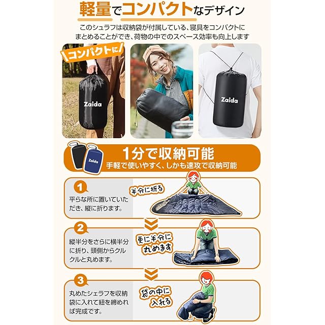 【超軽量・コンパクト収納】従来のモデルより軽量化!繊維構造は羽毛の繊維構造を人工的に再現し保温力と柔らかさ、軽さを実現しました。1kgの場合他社の1.2kgバージョンに匹敵できます。使用時サイズ:約210*75cm収納すれば、僅か40*20cmとなります。収納袋付き、小さくて超軽量なので、外出中負担感なく持ち運び便利です。寝袋を取り出すと、だんだん空気が充填されて太くなります。収納時、まず空気を十分排出しておいてください。そして、グルグル丸めて袋に押し込めば、しっかりと收纳袋に入ります。寝袋は測定方法がそれぞれなので、サイズ5cm以内誤差の可能性がありますので、予めご了承ください。