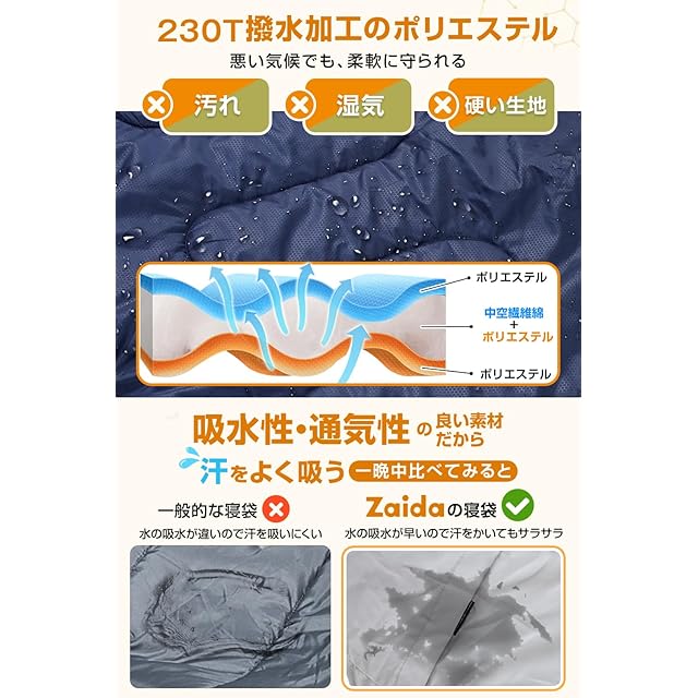 【230T超撥水・優れる素材】表地:耐水性と耐引き裂き性備え、耐水性の高い230Tナイロン素材を使用しておりますため、防水性・撥水性に優れているのが特徴です。野外で多少の雨や霧に見舞われても、体を濡らすことなく過ごせます。内生地:肌触りが良いソフト生地(ポリエステル100%)、柔らかくて快適な素材で、いつでも寝袋に入ると暖かい感じがします。中綿:防寒性が優れいるポリエステル100%、 保温性能が高いです。裏地:上質な繊維素材で質感がよく、ふとんのように柔らかくて肌触りがよい、寝袋に入った瞬間でも暖かく感じられます。