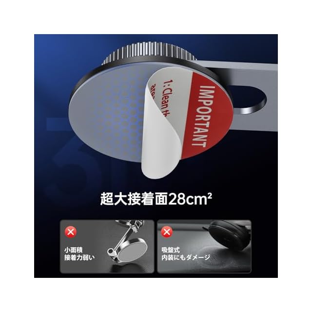 3M製強力両面テープ搭載:車載ホルダーの底部は高品質の3M両面テープを使用し、円形の6cm テープで、粘着面積が大きくなり、粘着の効果をできます。極寒でも夏場の暑い車内でも、粘着の効果が非常に安定しています。