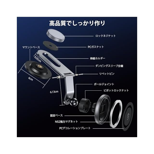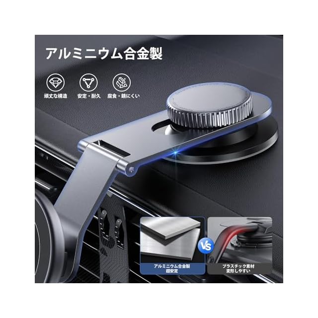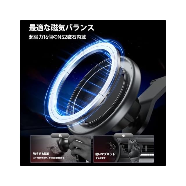 超強力磁力:業界最強N55磁石を16個搭載し、MagSafe対応スマホをガッチリと固定。N55磁石は一般的なN48磁石と比較して非常に強力な磁力を持っているため、悪路でガタガタ揺れる車内でもスマホが落ちにくくなります。MagSafe対応iPhoneに内蔵されているマグネットと同じ形状でマグネットを配置しているので、端末をピッタリ保持することが可能です。