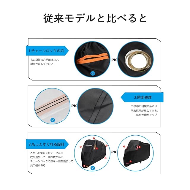 【優しいデザイン】製品正面の警告反射テープが二枚付くだけではなく、安全性を考えると、背面に警告反射テープを二枚追加される、またはチェーンロックの穴が前後両方も付く、錆びやすい金属製の穴に比べて、こちらが採用された布の縫製の穴の方がいい。裾を絞るゴムとワンタッチバックル付きの設計で、カバー飛びをよくに防止。