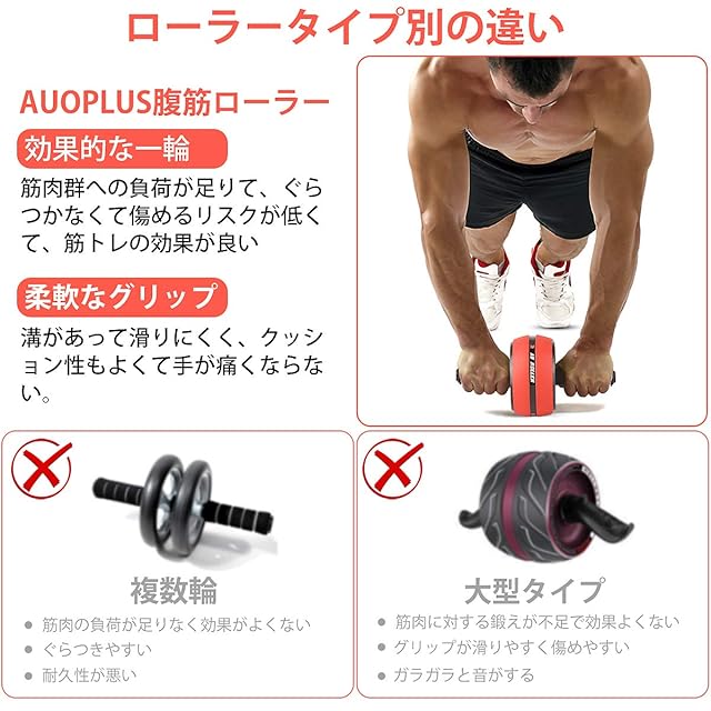 商品名:AUOPLUS 腹筋ローラー 膝マット付き 静音 一輪 アブホイール 腹筋 トレーニング器具 筋トレグッズ エクササイズローラー 体幹 ストレッチ ダイエット器具 男性/女性 初心者/上級者 アブローラー (レッド/ブラック)