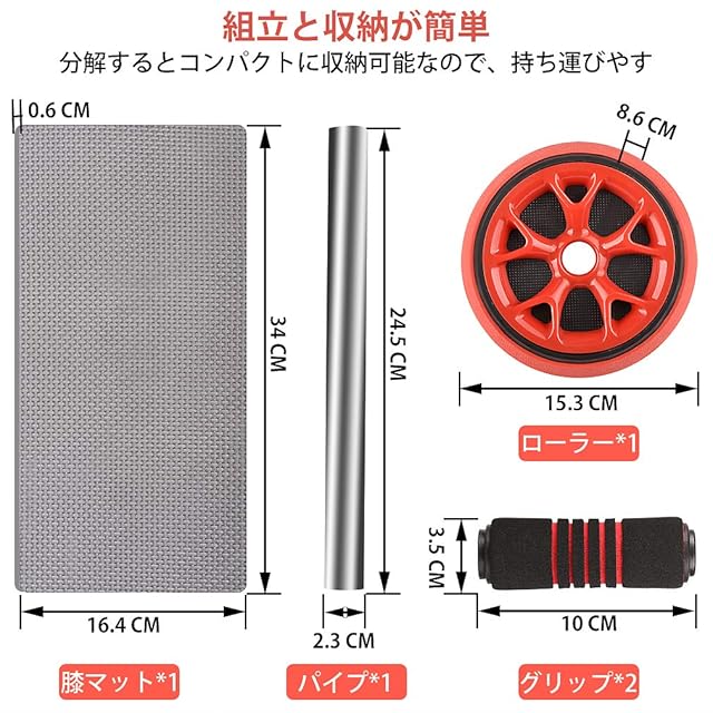 組立簡単:パイプをローラーに挿してグリップを取り付けば済む。誰かでも組み立てられて、とても簡単だ。輪の素材はPPとTPRで、耐荷重が約100KGまで耐えられ、フローリングや床に傷めにくく遮音にも役に立ってくれて、グリップの素材はEVAで、溝があり、滑りにくくクッション性もよくて手が痛くならない。※EVAは匂いがしますが、通風の所で1‐3日ぐらい置くと匂いが軽くなります。健康には影響がない。