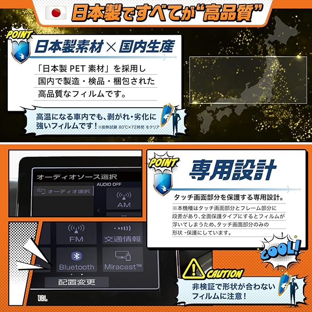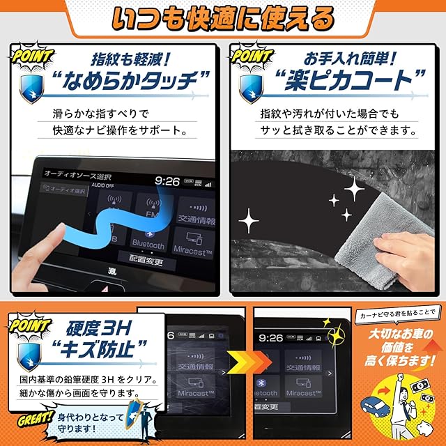 【スムースタッチ加工】:特殊コートにより、地図の操作でも指のひっかかりが少なく、ナビ操作を快適にします。 【傷つき防止】:国内基準の鉛筆硬度3Hをクリアしたフィルムで、引っかき傷などの細かな傷から画面を守ります。 【気泡防止】:弊社独自のシリコン吸着素材により、気泡は指やカードで簡単に押し出すことができます。貼り付けを失敗した場合でも貼り直しが可能です。