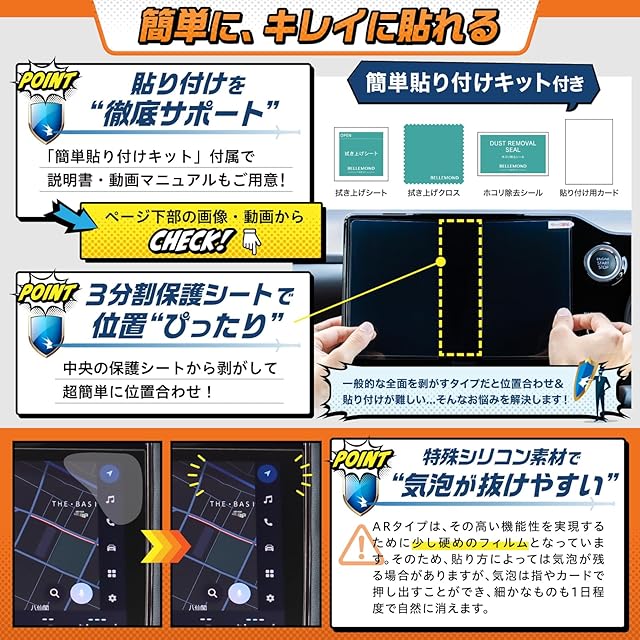 ※貼り付け後フィルムに分割線が見られる場合は、強く押してしっかり吸着させると消えます。 【対応機種】: 12.3インチ T-Connect SDナビゲーションシステム ※保護範囲はタッチパネル部分のみです。 【適合車種】: トヨタ ハリアー 4代目 80系 (2020年6月発売) 【適合確認済み】:日本メーカーのベルモンドが実際の端末で適合を確認した専用設計のフィルムです。 【セット内容】:AR PETフィルム 1枚、貼り付け用カード(スクレーパー)、付属品(拭き取りシート、クリーニングクロス、ホコリ除去シール) 【累計販売数300万枚突破】:日本メーカーのベルモンドはおかげさまで初心者様からリピーターまで多くの方に認められ、累計販売数が300万枚を突破いたしました。 【日本製PETフィルム】:日本国内で製造、検品、梱包された日本製PETフィルムです。 【超透明】:透過率96%の高透過フィルムなので、画面の美しさを損わず、鮮やかな画面のまま映像を楽しめます。 【低反射】反射率1.1%の低反射フィルムなので、反射や映り込みを軽減し、明るい車内でも画面が見やすくなります。 【指紋防止】:フィルム表面の特殊フッ素加工により、指紋が目立ちにくく、付着しても簡単に拭き取れます。 【スムースタッチ加工】:特殊コートにより、地図の操作でも指のひっかかりが少なく、ナビ操作を快適にします。 【傷つき防止】:国内基準の鉛筆硬度3Hをクリアしたフィルムで、引っかき傷などの細かな傷から画面を守ります。 【気泡防止】:弊社独自のシリコン吸着素材により、気泡は指やカードで簡単に押し出すことができます。貼り付けを失敗した場合でも貼り直しが可能です。
