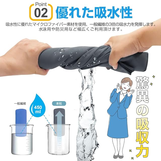 【超吸水・速乾・抗菌】見た目が薄くても吸水性に優れ、タオル専用のふわふわなマイクロファイバー繊維を使った吸水速乾タオル。極細繊維で肌触りもシルキーです。抜群の吸収力のうえ、軽くて肌触りも良く、耐久性も優れています。カビを防ぎ抗菌処理を施しました、汗を吸っても安心、濡らしたタオルに雑菌が繁殖するのも防いでくれます。