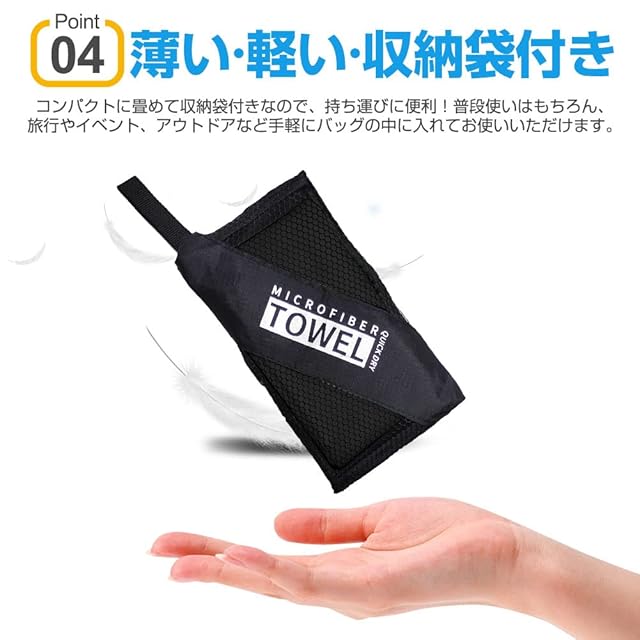 【コンパクトで軽量】薄い生地なので、折り畳み易く、簡単に収納袋に収まる。折り畳み時は、薄さは普通の綿タオルの1/4コンパクトなタオル。速乾タオルサイズ:40cm×80cm 付属品:収納袋