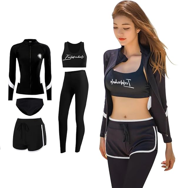 [ANGJ] フィットネス水着 レディース 水着 5点セット UVカット 長袖水着 水陸両用 スポーツブラ ショーツ ショートパンツ レギンス