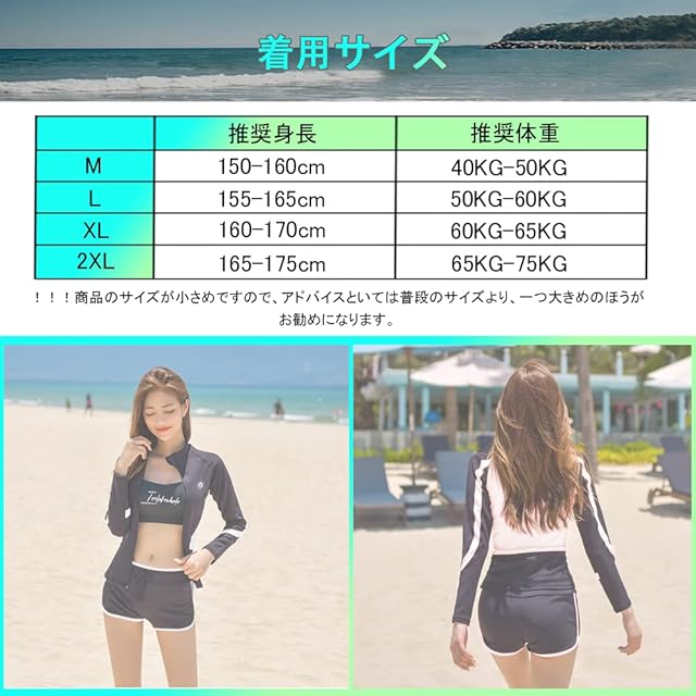 !!!商品のサイズが小さめですので、アドバイスといては普段のサイズより、一つ大きめのほうがお勧めになります。【セット内容&着用サイズ】長袖ラッシュガード、ショートパンツ、ブラ、レギンス、ビギニショーツがセットになっています。必要なものがセットになっているので、届いてすぐに海に行くことができます。長袖ラッシュガードとレギンスセット、レギンス付き足首まであるので、虫刺されやクラゲ対策、擦り傷などの外傷対策にも。【着用サイズ】【M: 推奨身長150-160cm/推奨体重:40KG-50KG】【L:推奨身長155-165cm/推奨体重:50KG-60KG】【XL:推奨身長160-170cm/推奨体重:60KG-65KG】【2XL:推奨身長165-175cm/推奨体重:65KG-75KG】※サイズを選択する時サイズ表を参照してください。