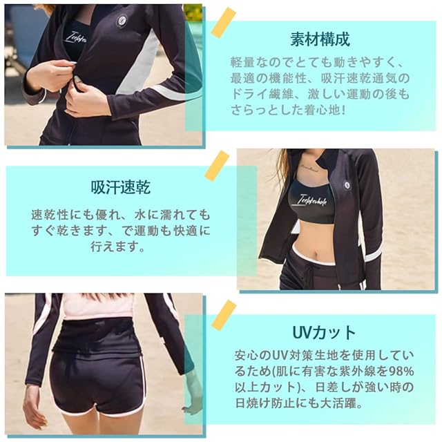 <b>【セット内容】</b><br/> 長袖ラッシュガード、ショートパンツ、ブラ、レギンス、ビギニショーツがセットになっています。長袖ラッシュガードとレギンスセット、レギンス付き足首まであるので、虫刺されやクラゲ対策、擦り傷などの外傷対策にも。<br/><br/> <b>【吸汗速乾】</b><br/> 速乾性に優れた水着素材なので、海やプールだけでなくジムやヨガなど 、汗をかくシーンでの使用もOK、水陸両用で全アイテム着たまま水に入れます。軽量なのでとても動きやすく、最適の機能性、吸汗速乾通気のドライ繊維、激しい運動の後もさらっとした着心地!<br/><br/> <b>【UVカット】</b><br/> 安心のUV対策生地を使用しているため(肌に有害な紫外線を98%以上カット)、日差しが強い時の日焼け防止にも大活躍。もちろん紫外線対策もばっちりでお肌を守ります、防菌防臭。<br/><br/> <b>【優れたデザイン】</b><br/> お洒落な柄プリントすっきりしたシンプルなデザイン、機能性だけでなくデザインも考え抜かれた商品です。襟元、手首、足首にスキンケアデザインを使って、運動の快適性をします。<br/><br/> <b>【適用場合】</b><br/> 夏場のウォータースポーツや野外活動の際、海、ジム、プールやビーチ、、温泉と幅広いジャンルで使える便利なスポーツ・アイテムです。通勤、通学、ランニング、ヨガなど、スポーツウェアとしてもご利用いただけます。