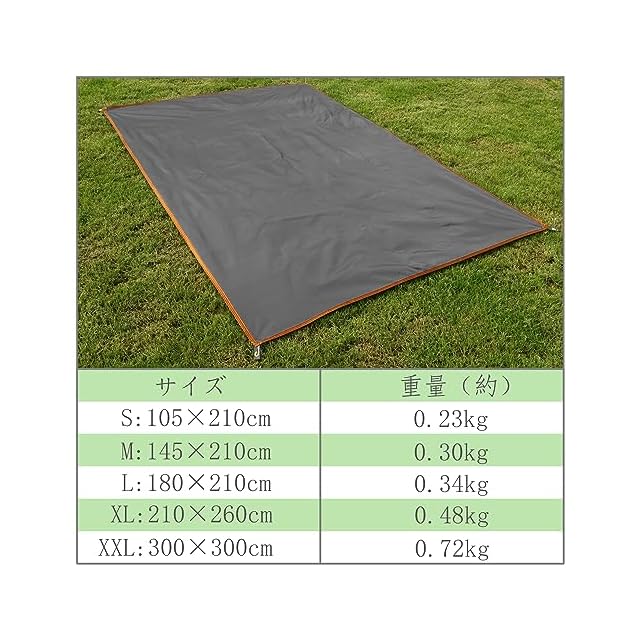 この商品について 使用サイズ:180*210cm 収納サイズ:24.5*23*2.5cm 重量:340g 素材生地:150 Dオックスフォード布(防水仕様)