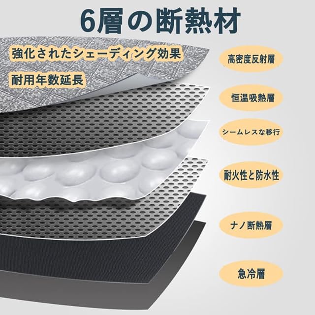 【6層構造*高品質素材】6層構造は断熱効果があり、特に夏には、まばゆいばかりの太陽が車のフロントガラスに当たると、太陽の下で車内がオーブンのようになり、長時間さらされると簡単に損傷する可能性があります。特殊断熱・紫外線防御生地、アルミホイル反射層、極厚高密度不織布を使用した高密度パラソルで、紫外線を効果的に遮断できるフードに優れています。また、99%以上の紫外線をカット出来ます。