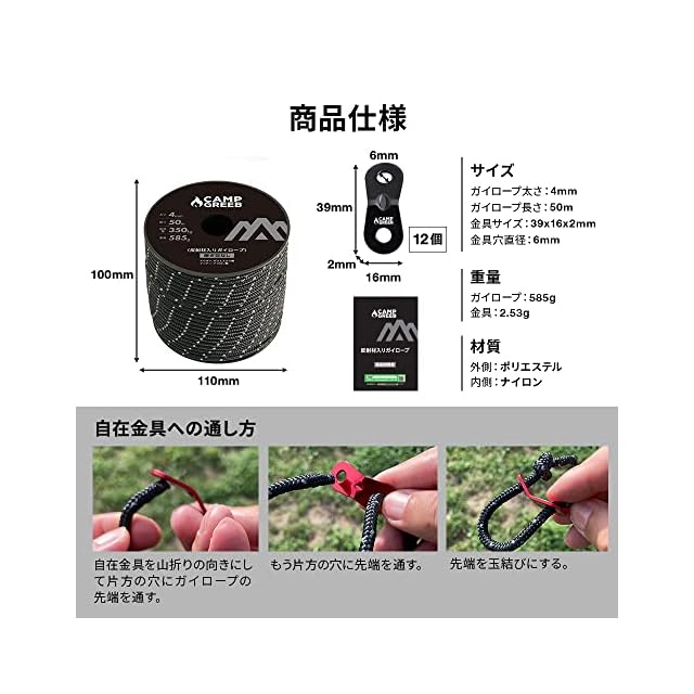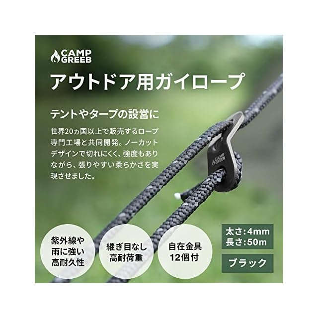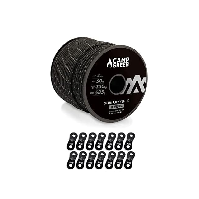 商品名:キャンプグリーブ 反射材入りパラコード 3mm/4mm/5mm ガイロープ 30m/50m巻 耐荷重240kg/350kg/420kg 自在金具12個付 継ぎ目なしノーカット テントロープ キャンプ (30, ブラック/4mm)