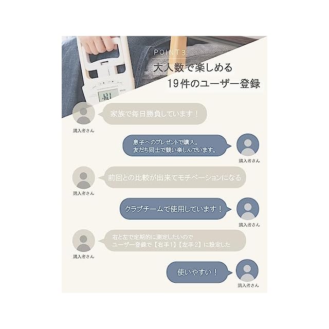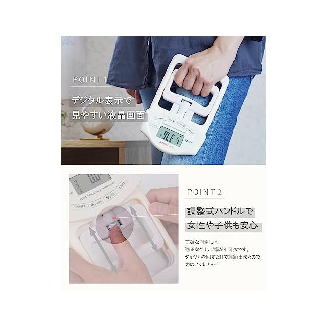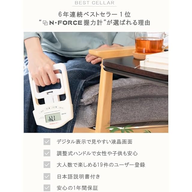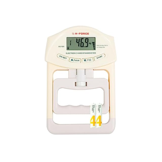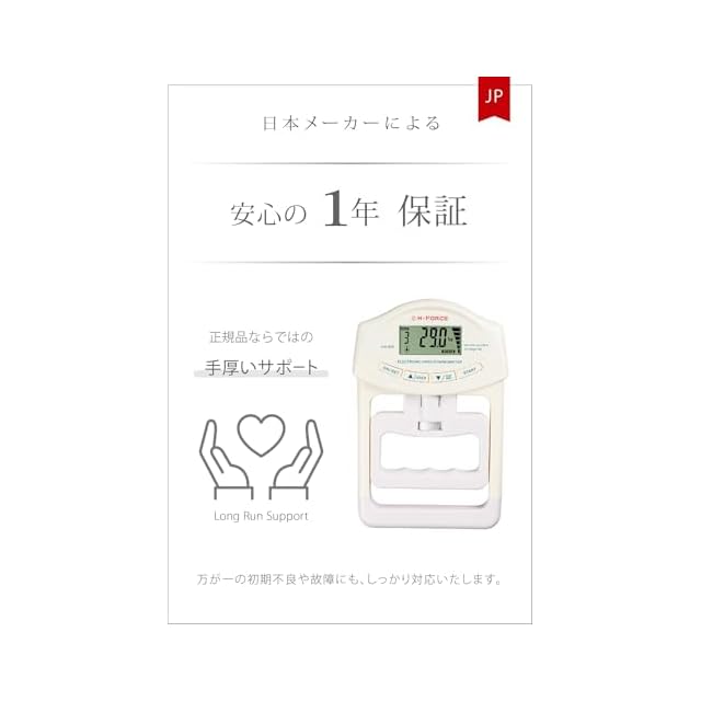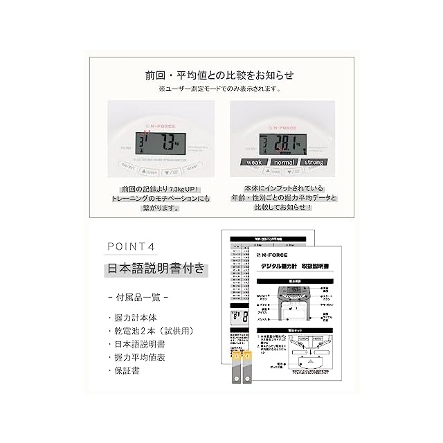 【※乾電池の挿入について】 本体裏面の電池ボックス蓋をスライドして開け、単4アルカリ電池を+が内側になるようにセットしてください。(電池がうまく入らない場合は、電池を指で回転させながら挿入することで簡単に入ります) 日本国内のスポーツジム、介護施設、学校、法人、団体への導入実績が多数あります。もちろん一般家庭でも多く使用されています。 大き目デジタルが特徴の握力測定器。N-FORCE正規品は、ユーザー登録機能付。 正規品ならではの機能1 ⇒ 前回の測定値を上回ると、液晶画面が教えてくれる。やる気が継続します。 正規品ならではの機能2 ⇒ 年齢/性別ごとの握力平均データがインプットされている。平均値は目標の目安になるので、とても便利です。 グリップの幅が自由に調整できるので、手の小さい女性や子供もご使用いただけます。 1年間の製品付き。 握力計測器必ず正規品の購入をお願いいたします。 【以外と知られていない握力の重要性】 ・重い荷物も持てるようになる ・握る力だけでなく、腕力の強化にもなる ・トレーニングすると、二の腕が太くなる デジタル液晶で0.1kg単位までがクッキリ表示されます。 最大90kgまで計測可能。以下の一般的なトレーニング器具との併用を推奨します。 ハンドグリップ ダンベル リストトレーナー トレーニングチューブ