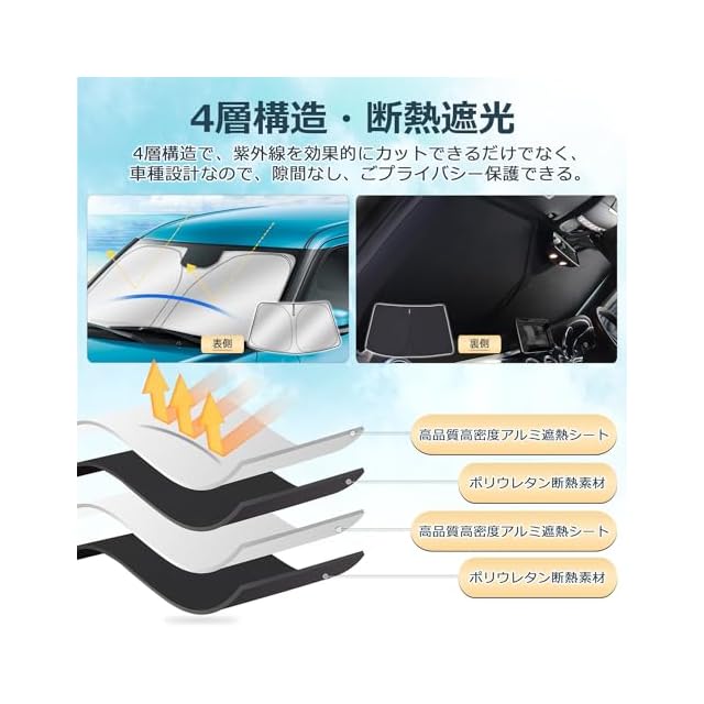 2.【4層構造】:1層目:高品質高密度アルミ遮熱シート、2層目:ポリウレタン断熱素材、3層目:高品質高密度アルミ遮熱シート、4層目:ポリウレタン断熱素材。高い断熱効果がある素材によって、夏の日で強い日差しを遮断して、車内の温度を減ります。また、紫外線を効果的にカットできます。冬の日で窓からの冷気の浸入を防ぎ、車内温度をキープして車中泊も快適です。エアコンの効率を良くするので省エネになります。従来品よりも遮光性や保温性を大幅にアップし、夏の日を温度下げて、冬の日を温度を上げる効果があります。エアコンの効率を良くするので省エネになります。ブラックメッシュ仕上げ。✔注意:他社の製品の外観は本社と同じく、でも相手は5層などを宣伝していますが、実際には本社と同じく2層構造です。✔本物の5層は厚くて使用不便、特に頻繁使用の場合、実用性はゼロになります。