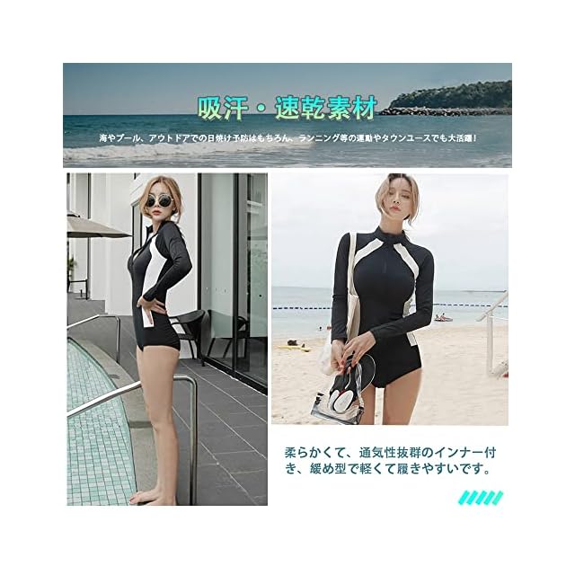 【素材構成&吸汗速乾】85%ポリエステル、15%スパンデックス。ソフトな肌触りの冷感素材を使用、良い着心地と抜群の耐久性。伸縮性に優れており、体形に合わせやすく、水中での動きも妨げないように体にフィットします。速乾性に優れた水着素材なので、海やプールだけでなくジムやヨガなど 、汗をかくシーンでの使用もOK、水陸両用で全アイテム着たまま水に入れます。軽量なのでとても動きやすく、最適の機能性、吸汗速乾通気のドライ繊維、激しい運動の後もさらっとした着心地!