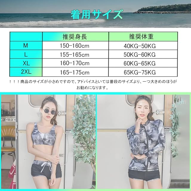 !!!商品のサイズが小さめですので、アドバイスといては普段のサイズより、一つ大きめのほうがお勧めになります。【セット内容&着用サイズ】長袖ラッシュガード、ショートパンツ、ブラ、レギンス、ビギニショーツがセットになっています。必要なものがセットになっているので、届いてすぐに海に行くことができます。長袖ラッシュガードとレギンスセット、レギンス付き足首まであるので、虫刺されやクラゲ対策、擦り傷などの外傷対策にも。【着用サイズ】【M: 推奨身長150-160cm/推奨体重:40KG-50KG】【L:推奨身長155-165cm/推奨体重:50KG-60KG】【XL:推奨身長160-170cm/推奨体重:60KG-65KG】【2XL:推奨身長165-175cm/推奨体重:65KG-75KG】※サイズを選択する時サイズ表を参照してください。