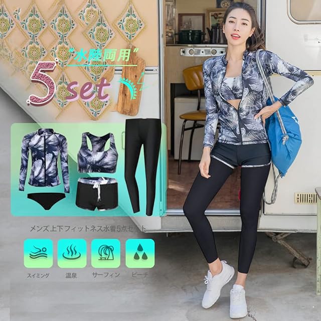 <b>【セット内容】</b><br/> 長袖ラッシュガード、ショートパンツ、ブラ、レギンス、ビギニショーツがセットになっています。長袖ラッシュガードとレギンスセット、レギンス付き足首まであるので、虫刺されやクラゲ対策、擦り傷などの外傷対策にも。<br/><br/> <b>【吸汗速乾】</b><br/> 速乾性に優れた水着素材なので、海やプールだけでなくジムやヨガなど 、汗をかくシーンでの使用もOK、水陸両用で全アイテム着たまま水に入れます。軽量なのでとても動きやすく、最適の機能性、吸汗速乾通気のドライ繊維、激しい運動の後もさらっとした着心地!<br/><br/> <b>【UVカット】</b><br/> 安心のUV対策生地を使用しているため(肌に有害な紫外線を98%以上カット)、日差しが強い時の日焼け防止にも大活躍。もちろん紫外線対策もばっちりでお肌を守ります、防菌防臭。<br/><br/> <b>【優れたデザイン】</b><br/> お洒落な柄プリントすっきりしたシンプルなデザイン、機能性だけでなくデザインも考え抜かれた商品です。襟元、手首、足首にスキンケアデザインを使って、運動の快適性をします。<br/><br/> <b>【適用場合】</b><br/> 夏場のウォータースポーツや野外活動の際、海、ジム、プールやビーチ、、温泉と幅広いジャンルで使える便利なスポーツ・アイテムです。通勤、通学、ランニング、ヨガなど、スポーツウェアとしてもご利用いただけます。