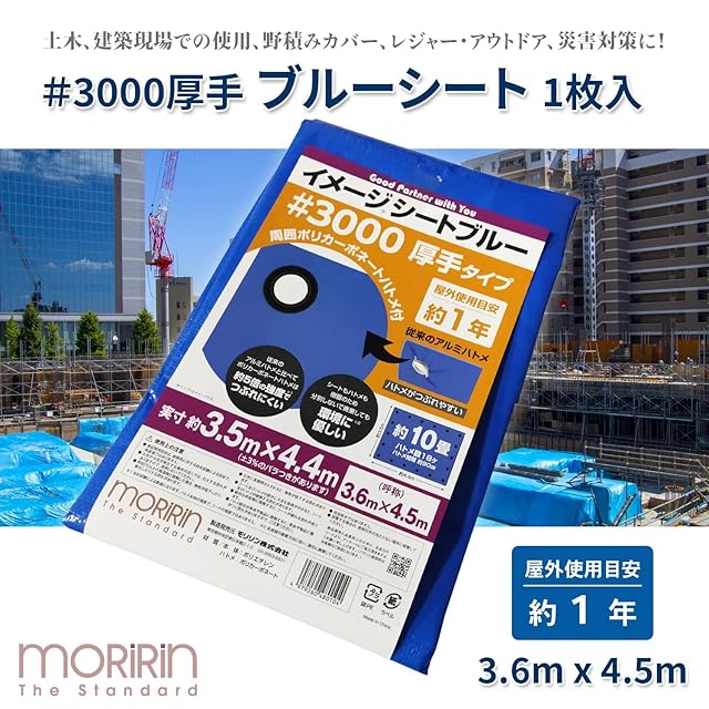 商品名:モリリン ブルーシート レジャーシート イメージシートブルー #3000 厚手 3.6×4.5m ポリカーボネートハトメ 使用目安約1年 1枚入