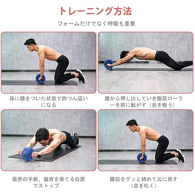 使い方:①床に膝をついた状態で四つん這いになる;②.腰から押し出していき腹筋ローラーを前に転がす。このとき背中は猫背のように少し丸めて、手首を返さないで丸めるように意識することがコツとなります;③限界の手前、猫背を保てる位置でストップ。限界まで伸ばしてしまうと、腰を痛める可能性があります。そのため、猫背を少し保てる位置でストップしましょう;④腹筋をグッと締めて元に戻す。元に戻すときは、腕で引っ張らないことがコツです! しっかりと腹筋に力を入れて元の状態へ戻しましょう。この時、おへそを見るように意識することで腰が中に入らないようにすることがポイントです。 以上が、これが正しいやり方です。