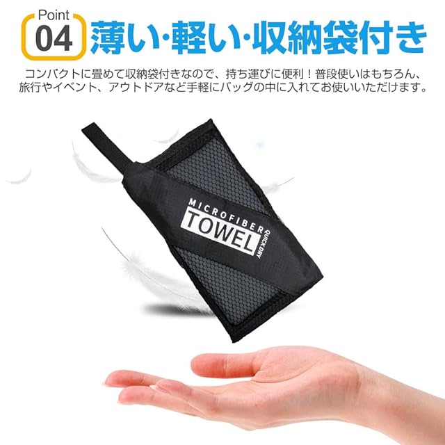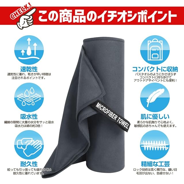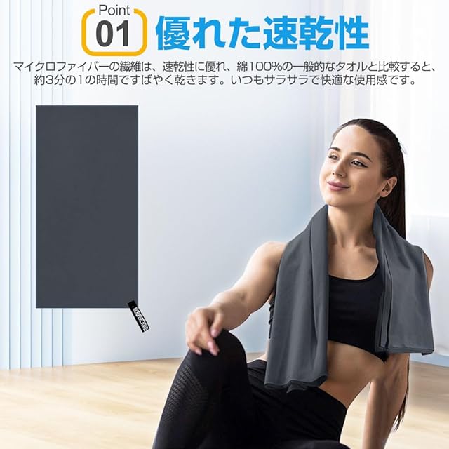 【超吸水・速乾・抗菌】見た目が薄くても吸水性に優れ、タオル専用のふわふわなマイクロファイバー繊維を使った吸水速乾タオル。極細繊維で肌触りもシルキーです。抜群の吸収力のうえ、軽くて肌触りも良く、耐久性も優れています。カビを防ぎ抗菌処理を施しました、汗を吸っても安心、濡らしたタオルに雑菌が繁殖するのも防いでくれます。