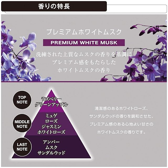 【プレミアムホワイトムスクの香り】人気のホワイトムスクの香りを基調に清潔感のあるホワイトローズとサンダルウッドを調和させた、心地よい甘さが至高の時を演出するプレミアムなホワイトムスクの香りです。上質な原材料から抽出した天然香料を配合。