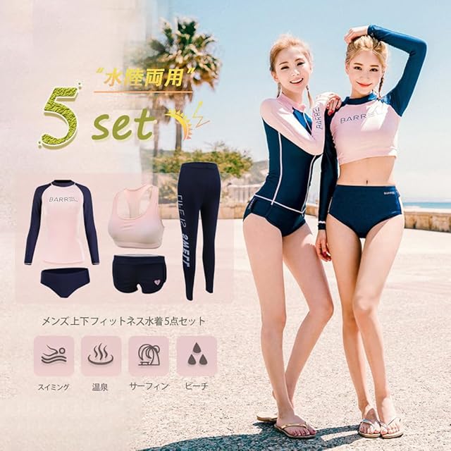 <b>【セット内容】</b><br/> 長袖ラッシュガード、ショートパンツ、ブラ、レギンス、ビギニショーツがセットになっています。長袖ラッシュガードとレギンスセット、レギンス付き足首まであるので、虫刺されやクラゲ対策、擦り傷などの外傷対策にも。<br/><br/> <b>【吸汗速乾】</b><br/> 速乾性に優れた水着素材なので、海やプールだけでなくジムやヨガなど 、汗をかくシーンでの使用もOK、水陸両用で全アイテム着たまま水に入れます。軽量なのでとても動きやすく、最適の機能性、吸汗速乾通気のドライ繊維、激しい運動の後もさらっとした着心地!<br/><br/> <b>【UVカット】</b><br/> 安心のUV対策生地を使用しているため(肌に有害な紫外線を98%以上カット)、日差しが強い時の日焼け防止にも大活躍。もちろん紫外線対策もばっちりでお肌を守ります、防菌防臭。<br/><br/> <b>【優れたデザイン】</b><br/> お洒落な柄プリントすっきりしたシンプルなデザイン、機能性だけでなくデザインも考え抜かれた商品です。襟元、手首、足首にスキンケアデザインを使って、運動の快適性をします。<br/><br/> <b>【適用場合】</b><br/> 夏場のウォータースポーツや野外活動の際、海、ジム、プールやビーチ、、温泉と幅広いジャンルで使える便利なスポーツ・アイテムです。通勤、通学、ランニング、ヨガなど、スポーツウェアとしてもご利用いただけます。