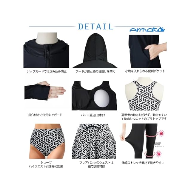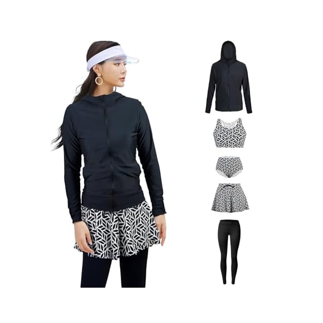 [ARMOTO] 水着 レディース フィットネス 長袖 ラッシュガード フード付き ビキニ ショートパンツ レギンス ショーツ 5点上下セット 大きいサイズ 体型カバー | Trend Design BASE店