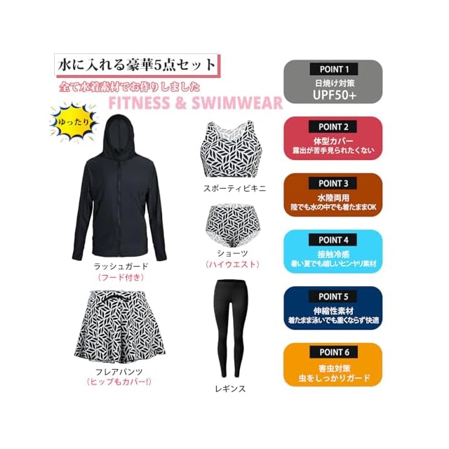 【豪華五点セット】長袖ラッシュガード(フード付き) フレアパンツ(ヒップもカバー!) スポーティビキニ ショーツ(ハイウエスト) レギンス