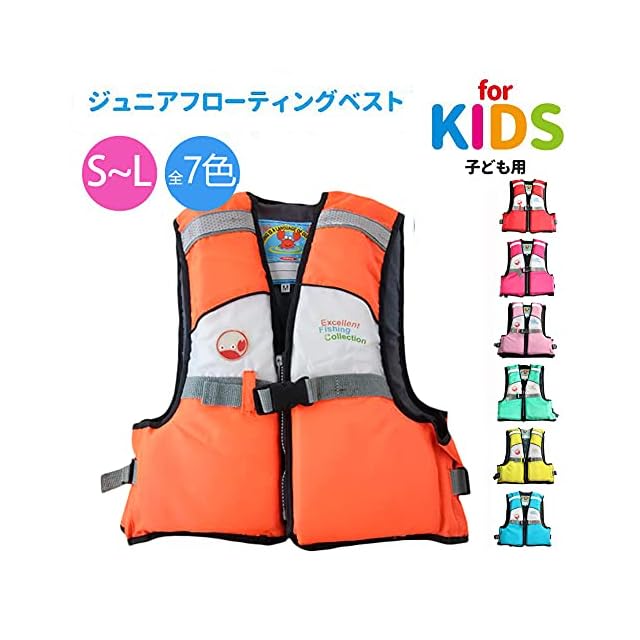 【7色で3サイズ】 ピング、青、黄、緑、赤、オレンジと蛍光色で合計7色、S、M、Lで3サイズ用意しておりるキッズ用ライフジャケット、男の子、女の子、ユニセックスに問わず、10KGな子供より30KGなジュニアまでも対応でき、腰ベルトと股ベルトは装着後、体にしっかり固定でき、浮き輪のように体から抜ける心配がありません、さまざまな体型の方でも快適な装着できます。
