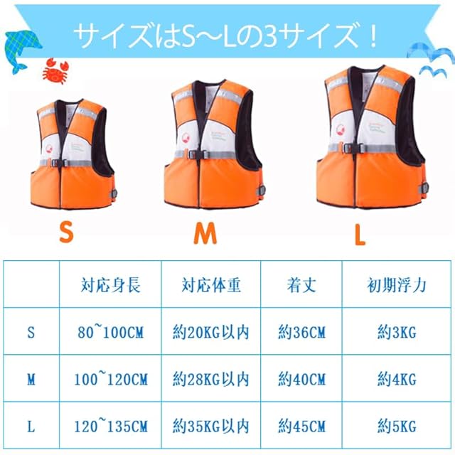 【7色で3サイズ】 ピング、青、黄、緑、赤、オレンジと蛍光色で合計7色、S、M、Lで3サイズ用意しておりるキッズ用ライフジャケット、男の子、女の子、ユニセックスに問わず、10KGな子供より30KGなジュニアまでも対応でき、腰ベルトと股ベルトは装着後、体にしっかり固定でき、浮き輪のように体から抜ける心配がありません、さまざまな体型の方でも快適な装着できます。