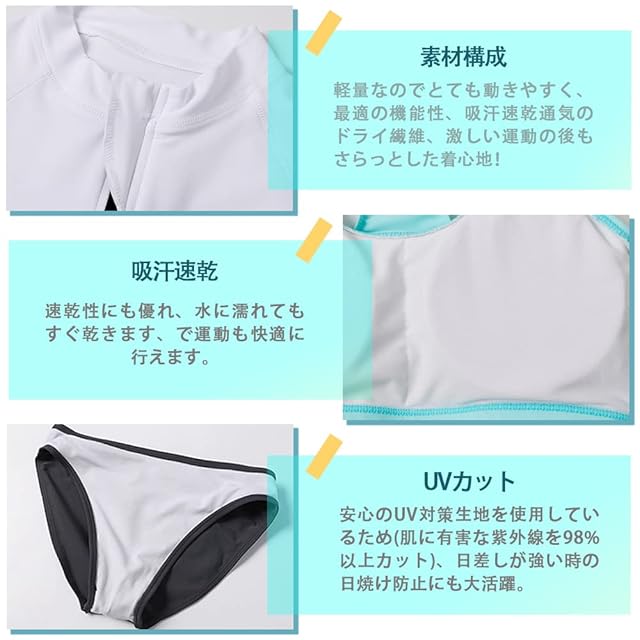 【素材構成&吸汗速乾】85%ポリエステル、15%スパンデックス。ソフトな肌触りの冷感素材を使用、良い着心地と抜群の耐久性。伸縮性に優れており、体形に合わせやすく、水中での動きも妨げないように体にフィットします。速乾性に優れた水着素材なので、海やプールだけでなくジムやヨガなど 、汗をかくシーンでの使用もOK、水陸両用で全アイテム着たまま水に入れます。軽量なのでとても動きやすく、最適の機能性、吸汗速乾通気のドライ繊維、激しい運動の後もさらっとした着心地!